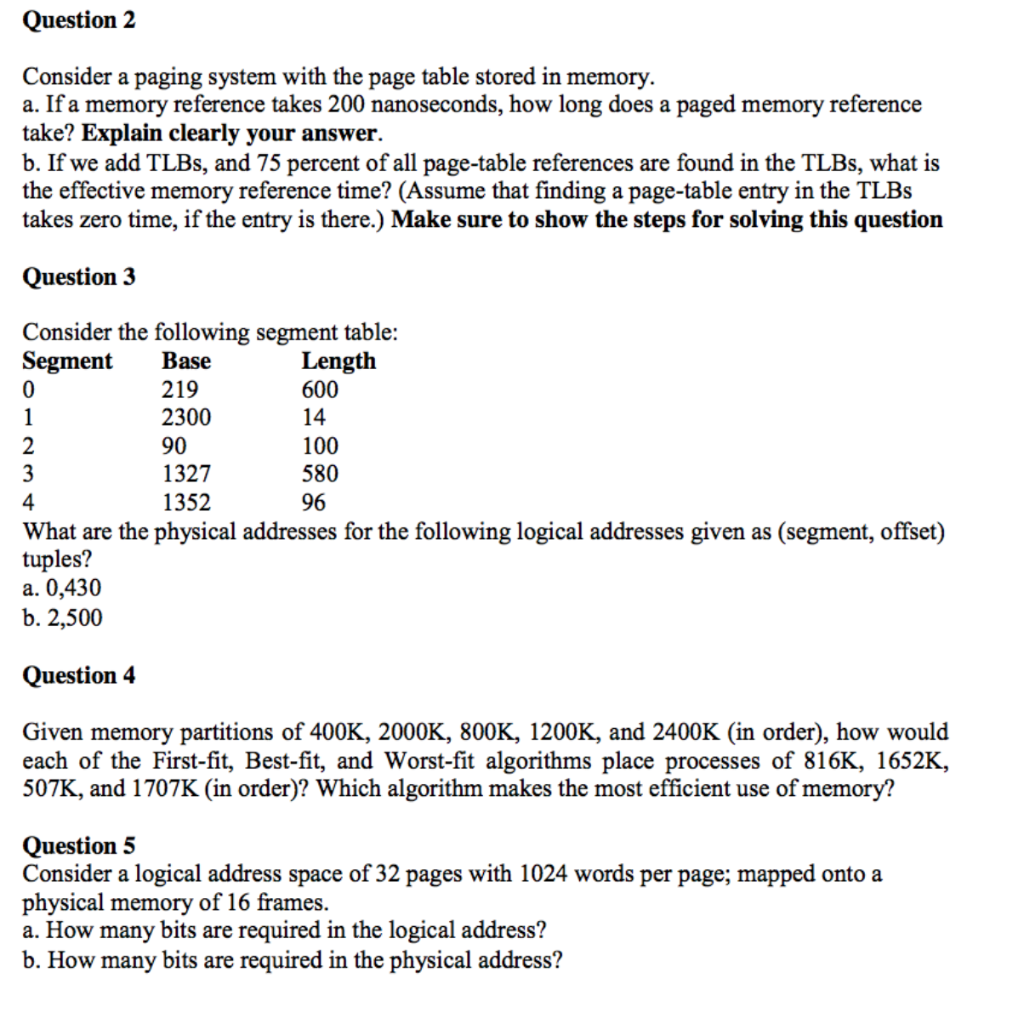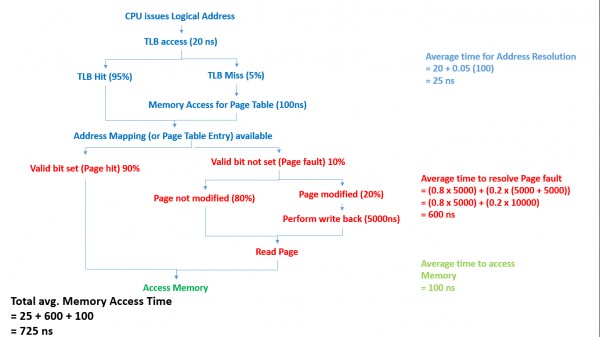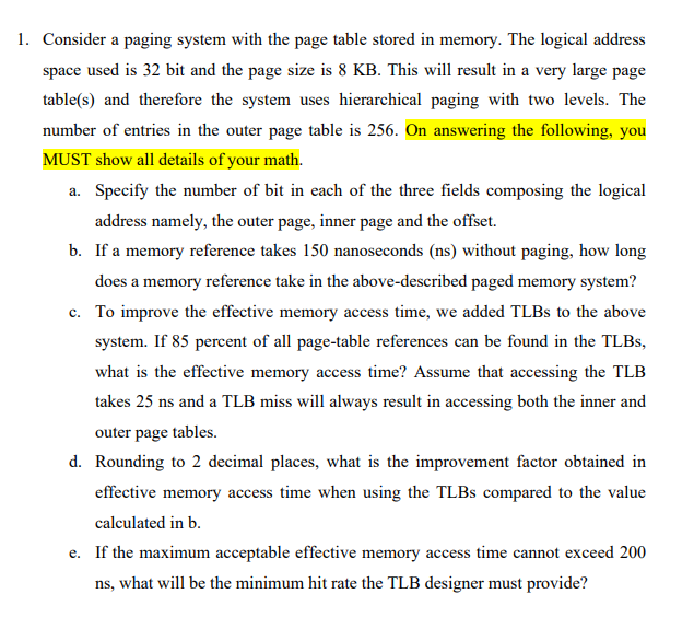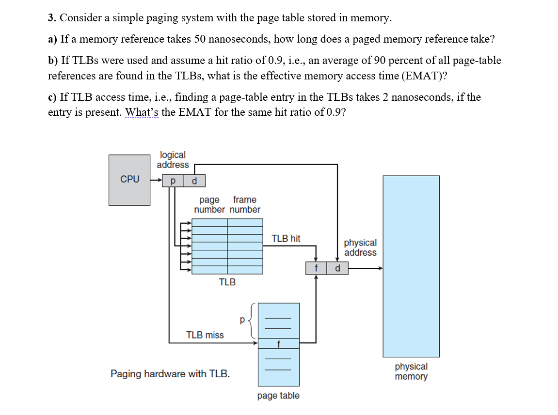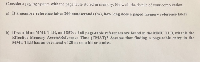 If a memory reference takes 300 nanoseconds how long does a paged memory reference take. If we add associative registers and 80 percent of all page-table references are found in the associative registers TLB what is the effective memory reference time. This table contains a mapping between the virtual addresses and physical addresses. If we add TLBs and 75 percent of all page-table references are found in the TLBs what is the effective memory reference time. If a memory reference takes 200 nanoseconds how long does a paged memory reference take. 1 mark X 3 3 marks i Identify the effective memory access time. Consider a paging system with the page table stored in memory.